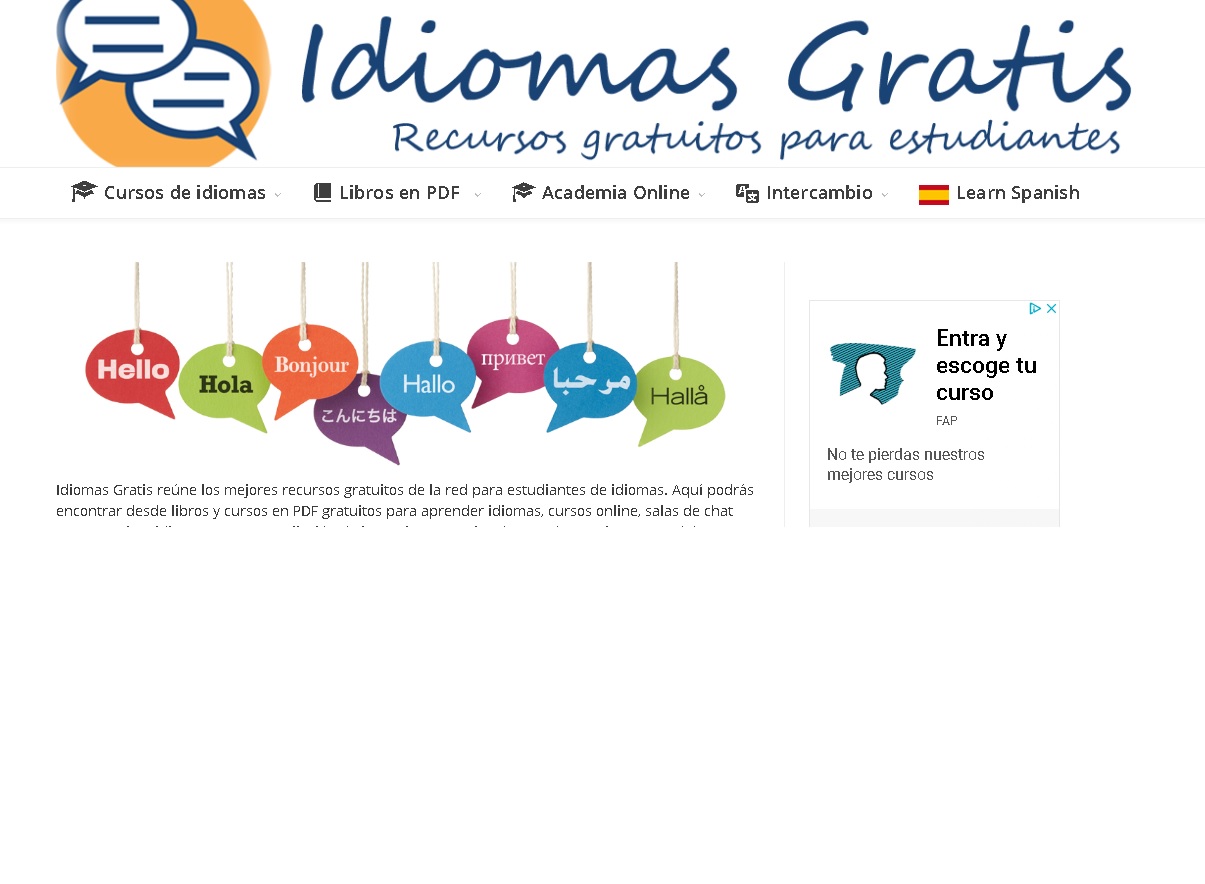IDIOMASGRATIS Idiomasgratis reúne recursos gratuitos en red para estudiantes de idiomas.aquí podrás encontrar desde libros y cursos en PDF gratuitos,cursos online, salas de chat para practicar idiomas una recopilación de los mejor es canales de Youtube con los que podrás aprender idiomas sin gastarte ni un euro. Enlace a Internet 13/02/2023