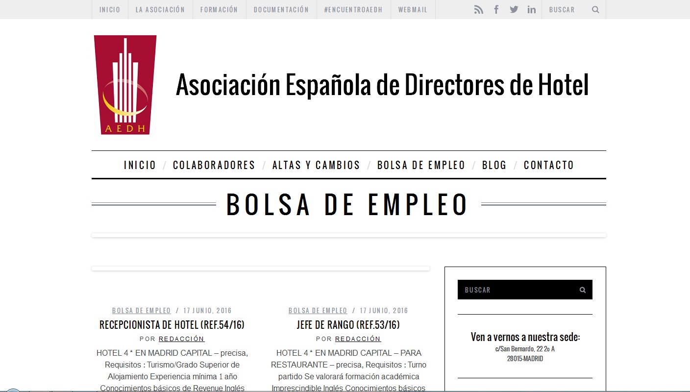 ASOCIACIÓN ESPAÑOLA DE DIRECTORES DE HOTEL (AEDH) Bolsa de trabajo para cubrir puestos en hoteles. Asociación que representa a un reconocido colectivo de profesionales de las actividades turísticas. Colabora con todas las actividades/organizaciones públicas y/o privadas en la protección de España como país turístico multicultural, estimulando aquellas iniciativas que tengan como principal objetivo la innovación y la mejora continua. Enlace a Internet 28/03/2020