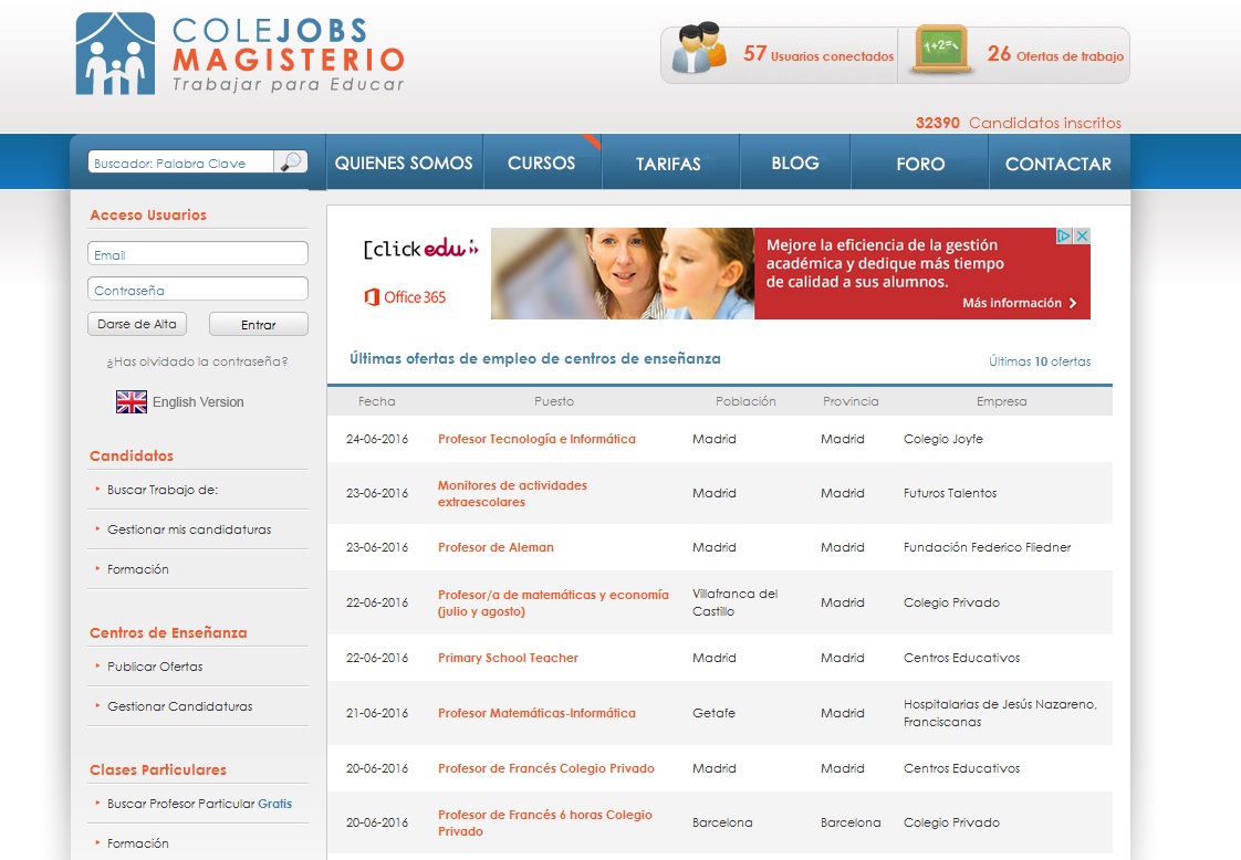 COLEGIOS Web que dispone de ofertas de empleo para profesores y maestros realizadas directamente por los Centros Educativos. Tiene la opción igualmente de descargar gratuitamente una Base de Datos de colegios privados y concertados de toda España, lista para imprimir en sobres. Precisa registrarse. Dispone de otra opción, ésta de pago, en la que permite inscribir el perfil profesional para que sea visible por los Directores y puedan encontrar el maestro o profesor adecuado a su Centro Educativo. Los tipos de centros que tienen acceso a la plataforma son, exclusivamente, colegios, guarderías, escuelas y centros de FP Enlace a Internet 20/01/2022