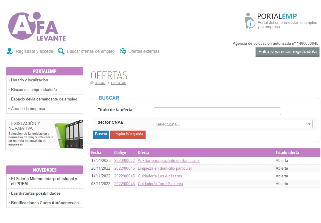 PORTALEMP Las circunstancias de cada familia pueden impedir que la persona con alzhéimer sea atendida como se merece. Por eso, desde AFA Levante le facilitamos la búsqueda de un auxiliar que se ocupe de su familiar. Puede hacerlo desde nuestra bolsa de empleo, a través de la cual puede establecer parámetros para encontrar al trabajador que mejor se ajuste a sus necesidades. Enlace a Internet 08/02/2023